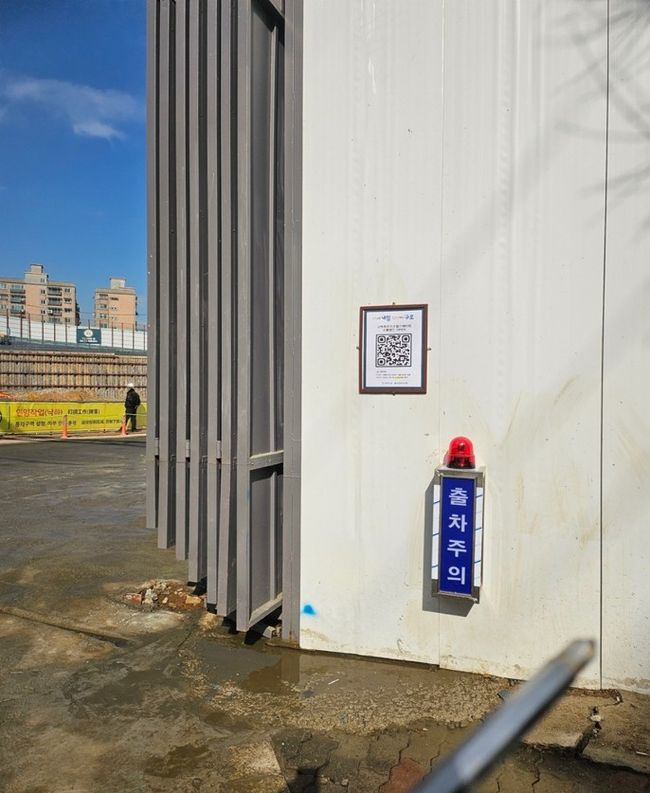 고척4주택재개발정비사업(고척 푸르지오 힐스테이트) 공사 현장 출입구에 부착된 공사 정보 안내 큐알(QR)코드 모습.